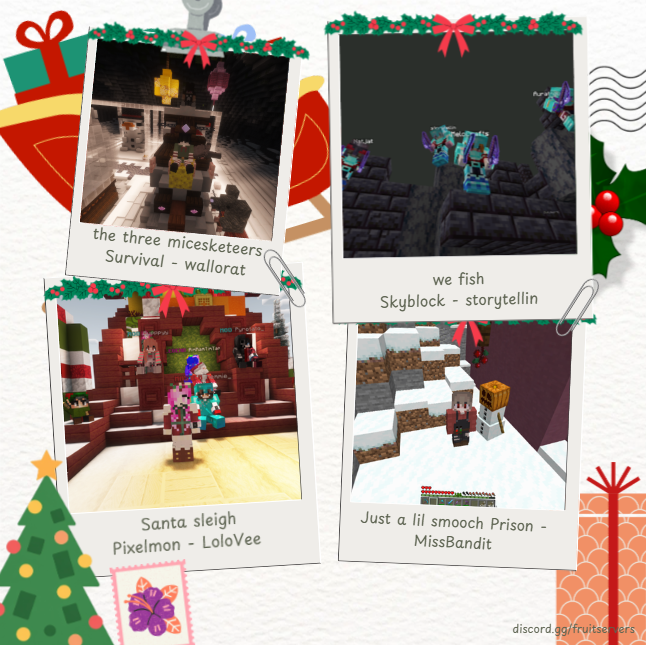 Fruitmas is in the air for another year and as always, the staff, event and amazing builder teams have outdone themselves with some truly awesome events and activities! The Fruitmas areas on each server contain tons of activities for you to do, from word searches, parkours, spot the different, other minigames and more! Make sure to check out each area ingame at /warp fruitmas