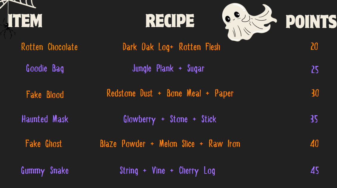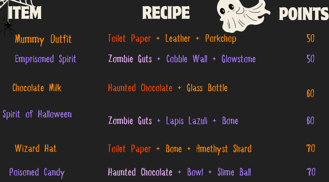 We have signs dedicated to all our recipes and the ingredients you need to craft them. Once you craft the recipe items, turn them into The Witch with a minimum of 500 points for a prize based on the number of points you submit!